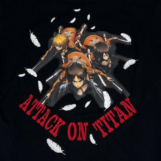 フロントには立体感ある「進撃の巨人」ロゴ刺繍、バックにはエレン・ミカサ・アルミンの三人が立体機動装置を構えた迫力のデザインをプリント。
